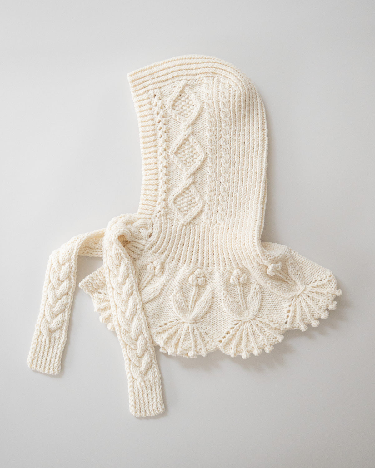 ふわっと軽い糸のため、冬から肌寒い春先までのながい季節でご愛用いただけます。さらにこの糸の魅力は、編み地をはっきり見せてくれること。アランニット特有のふっくらとした美しい編み模様は、手編みでこそ表現できる、ハンドニットの中でも特別な柄です。