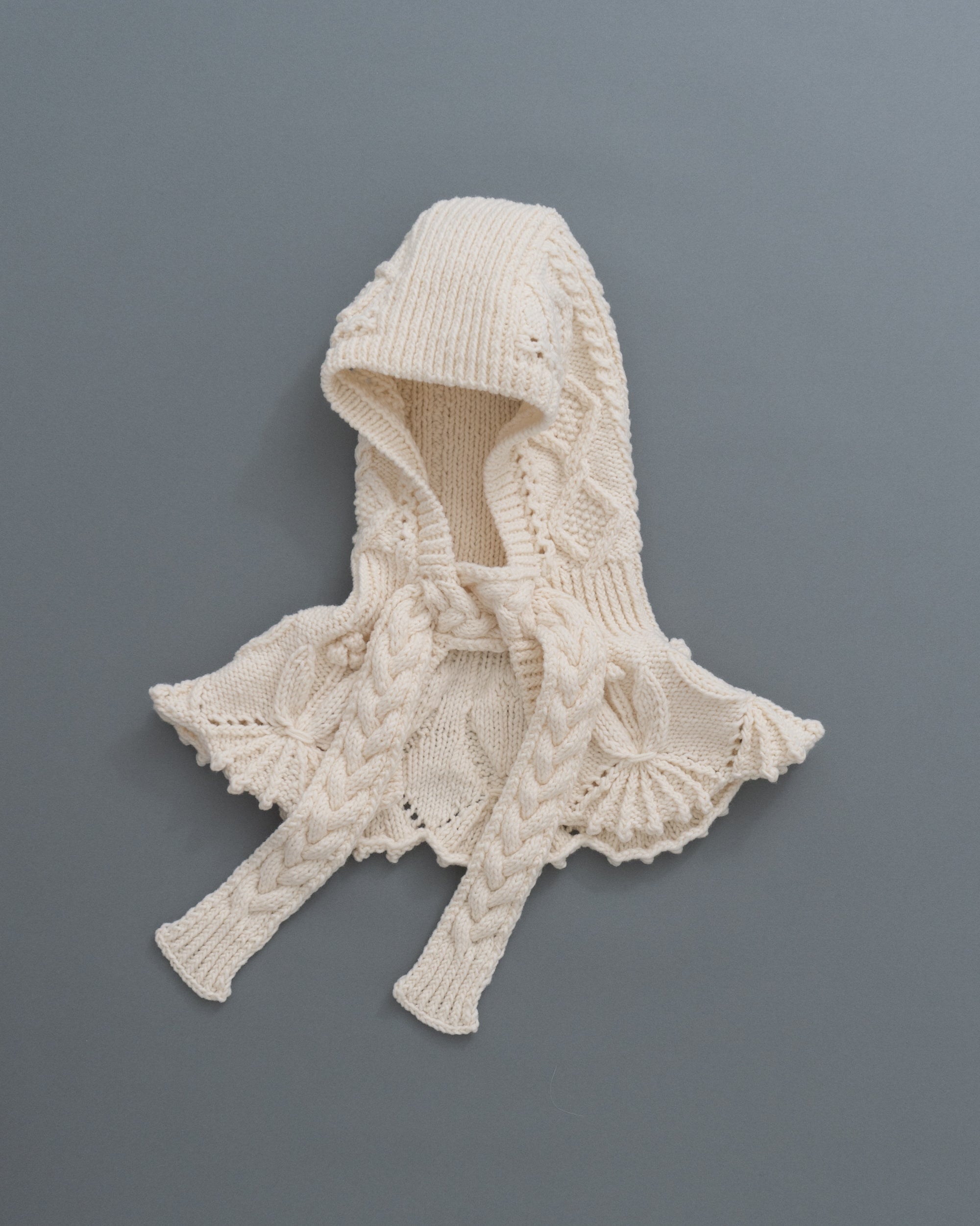 肩までふわりと身体ごとやわらかく包んでくれる、襟付きのニット帽ケープ。